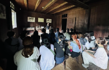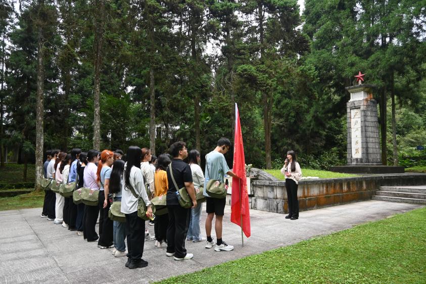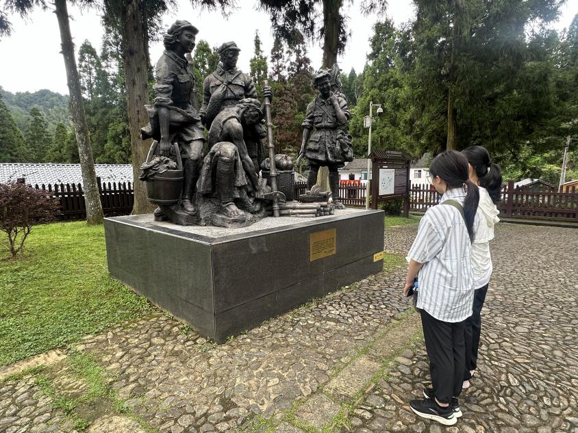 上午,同学们首先来到小井红军医院开展现场教学。这座由毛泽东同志指示筹建、军民共同捐资1000块大洋建成的医院,是中国共产党历史上第一所正规红军医院。原建筑在第三次反“会剿”期间被敌人焚毁,现址为1967年按原貌重建。院内陈列的粗布被褥、生锈药罐和竹片担架等物品,生动展现了当年武器简陋、缺医少药的艰难岁月。尤其是张子清师长在无麻药手术中省下食盐让给战友,最终壮烈牺牲的事迹,深深触动了在场的每一位同学。通过触摸土墙、凝视旧物,同学们深刻体会到“艰苦奋斗”不仅是一段历史,更是一种跨越时空、历久弥新的精神力量。